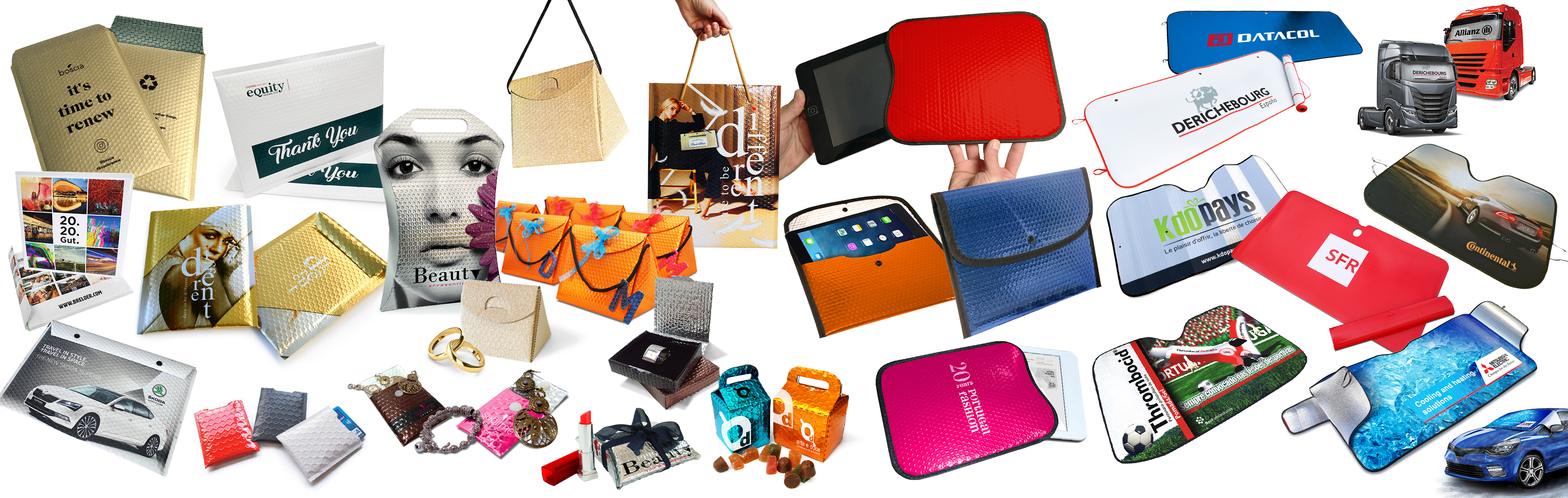 Possiamo dare vita a soluzioni estremamente funzionali e creative, tra le quali: buste, scatole e confezioni di varie dimensioni, parasole, espositori da terra e da banco, borse e tanto altro ancora…