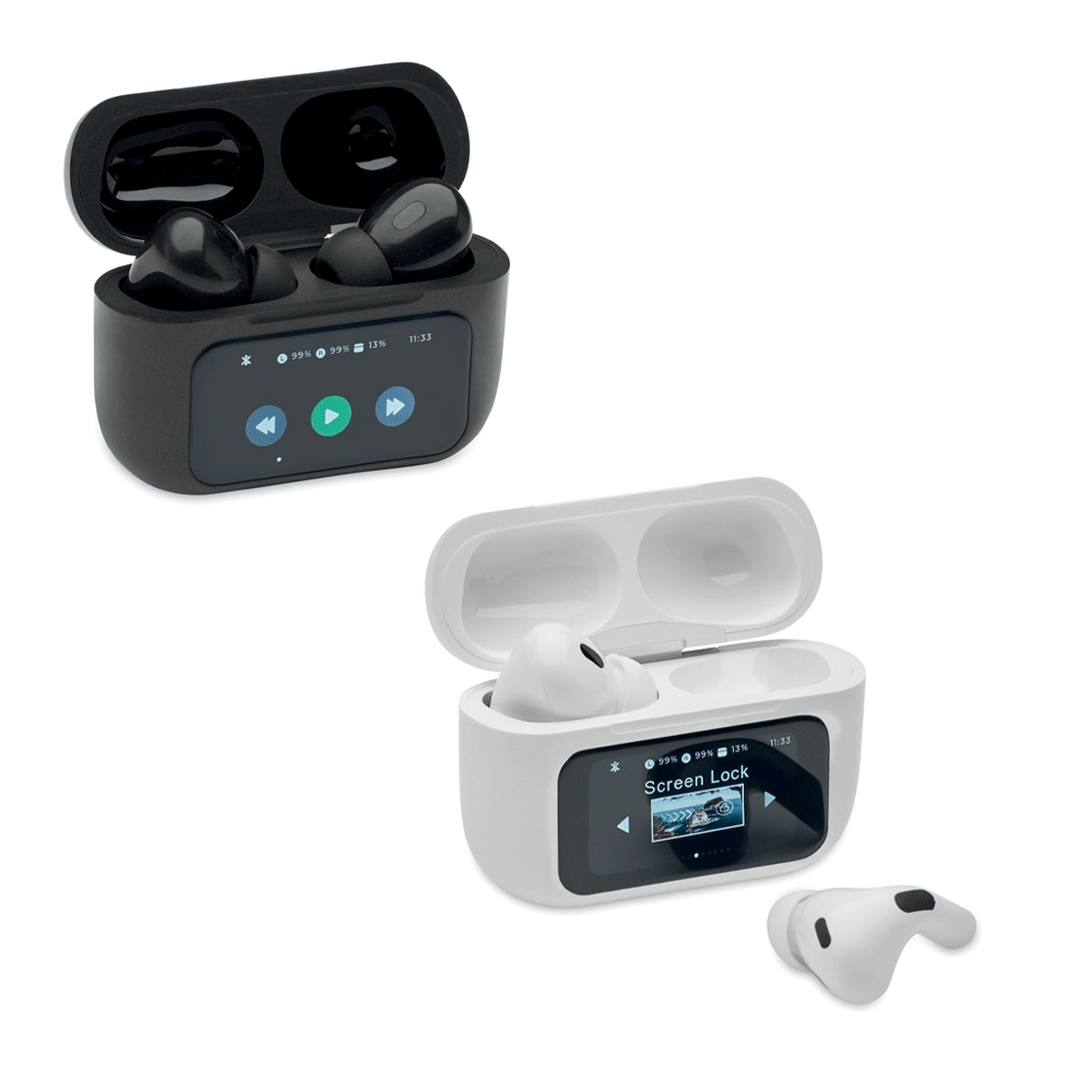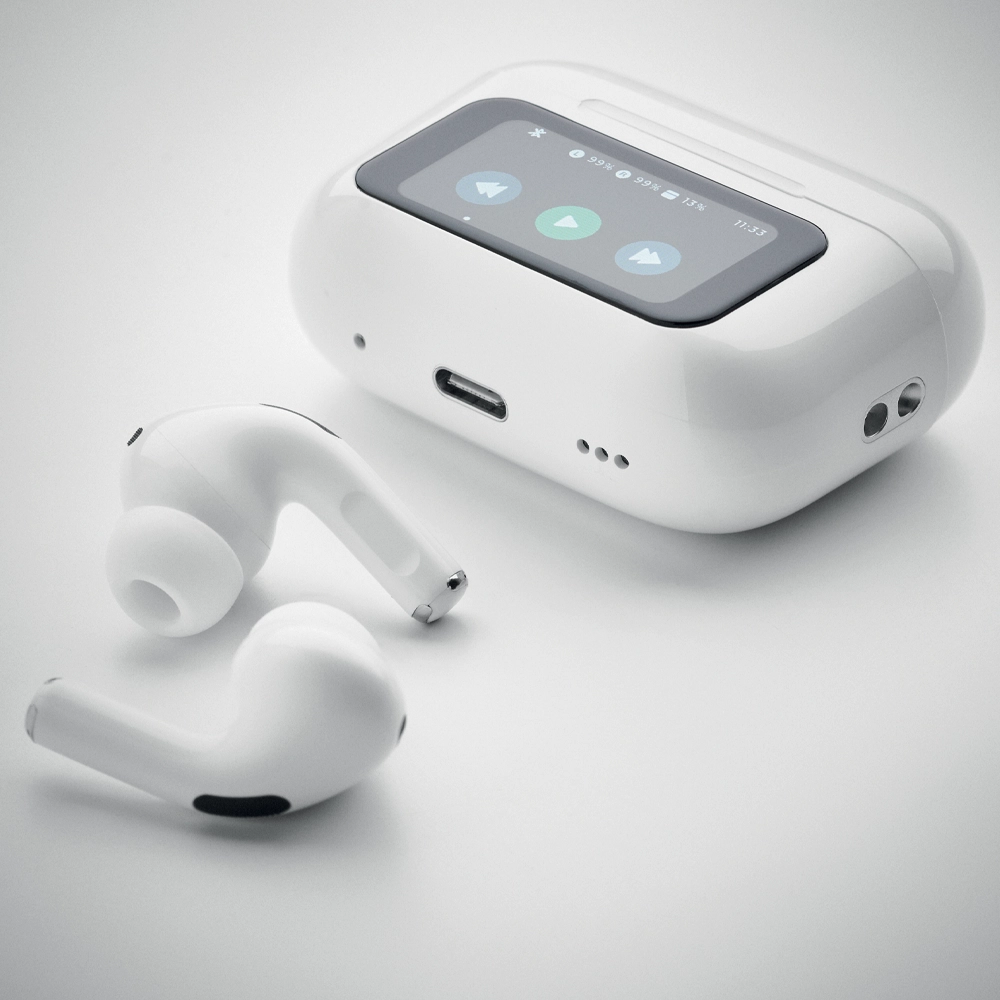 Auricolari stereo True Wireless Stereo (TWS) 5.0 in ABS (30 mAh) con ANC/ENC, microfono e base di ricarica da 230 mAh. Display touch screen.