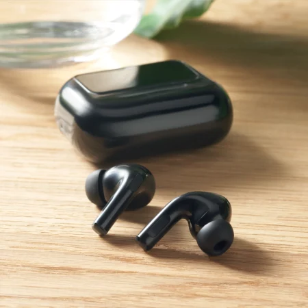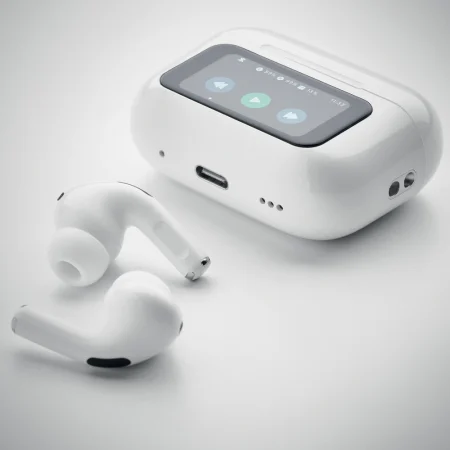 Auricolari stereo True Wireless Stereo (TWS) 5.0 in ABS (30 mAh) con ANC/ENC, microfono e base di ricarica da 230 mAh. Display touch screen.