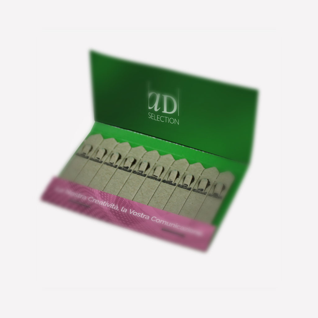 Riprendendo il design classico delle confezioni pieghevoli dei fiammiferi, invece dello zolfo sono applicati dei semi. Questo articolo originale può essere personalizzato con una forma su misura e stampato in quadricromia su tutta la superficie, l’ideale per una comunicazione green davvero unica e fuori dal comune.
