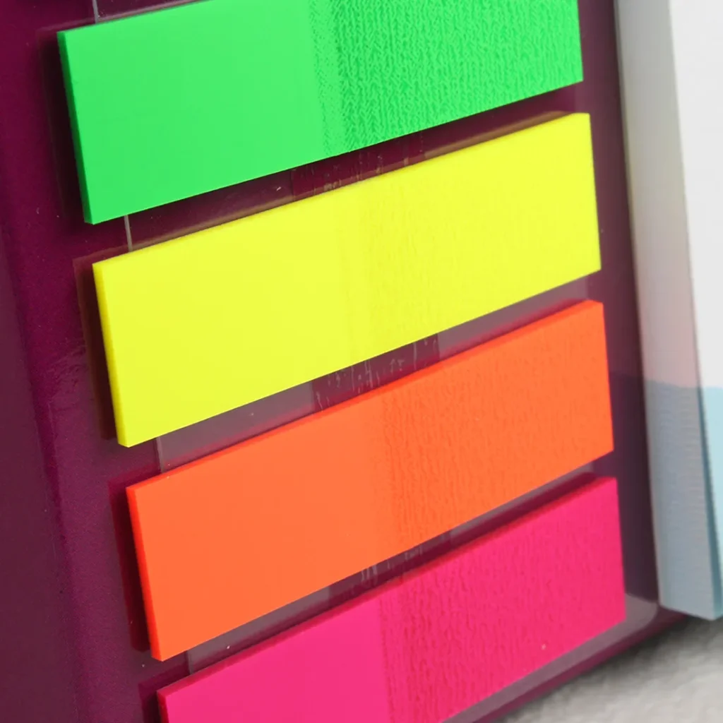 Mini organizer da scrivania con foglietti per appunti di formato cm 9 x 9 personalizzabili, index evidenziatori e altro blocchetto di foglietti sempre personalizzabili di dimensioni cm 5 x 7.