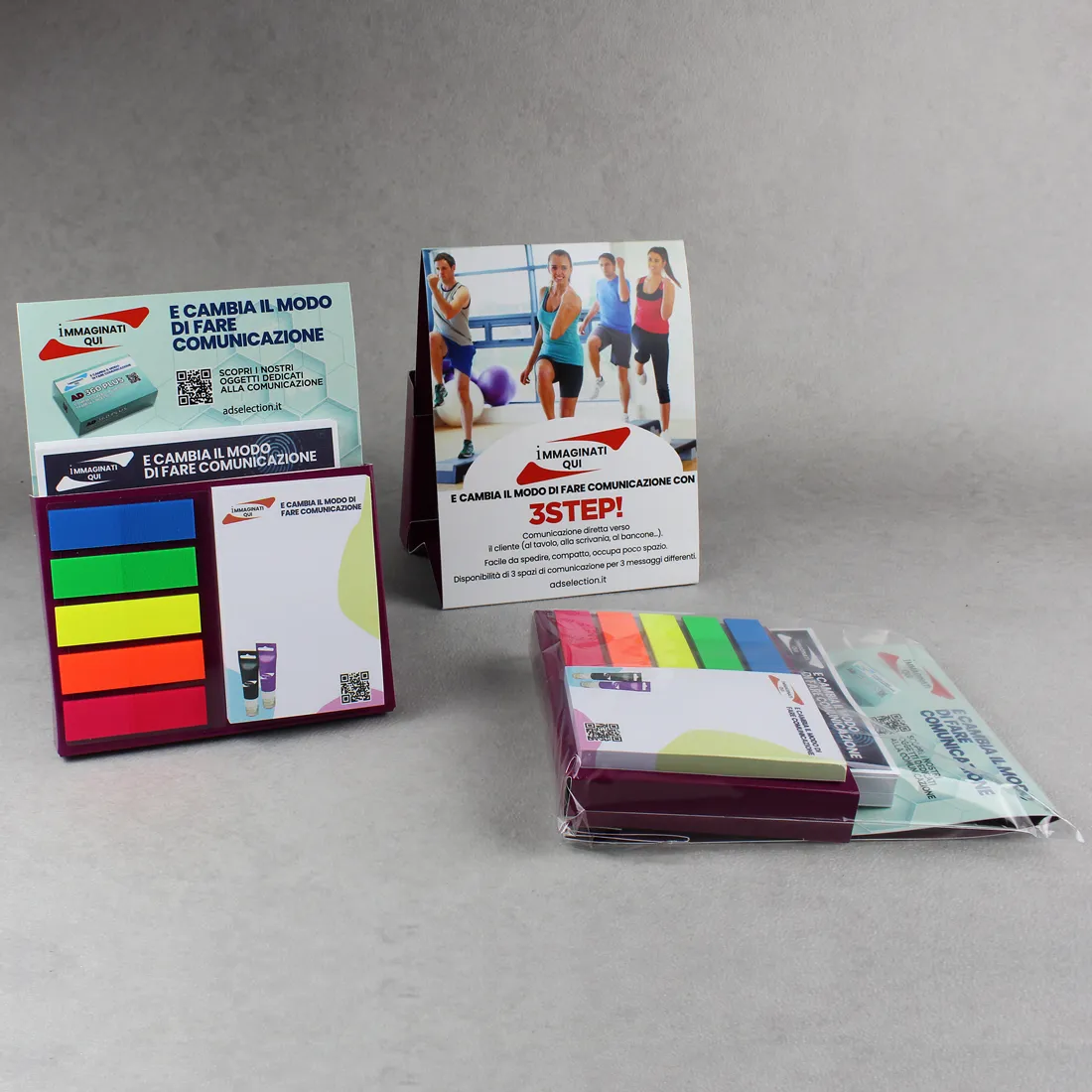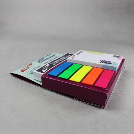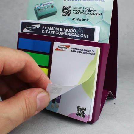 Mini organizer da scrivania con foglietti per appunti di formato cm 9 x 9 personalizzabili, index evidenziatori e altro blocchetto di foglietti sempre personalizzabili di dimensioni cm 5 x 7.