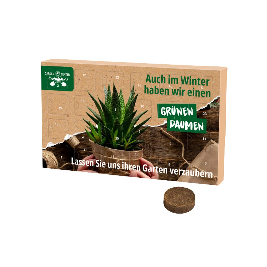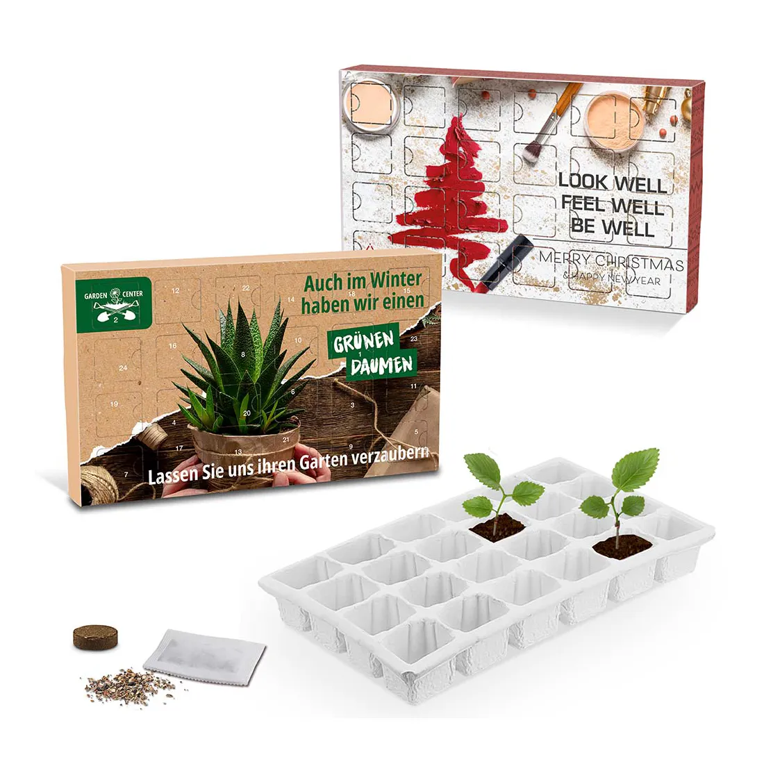 Per gli amanti del green! Stupisci i tuoi contatti con il calendario con i semi: ogni giorno puoi far crescere una piantina nuova! Il calendario dell’avvento è un classico sempre apprezzato, ma con la tua comunicazione green!