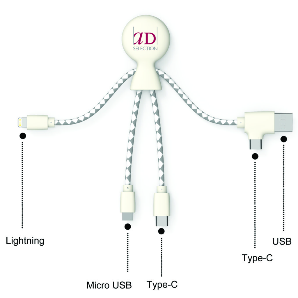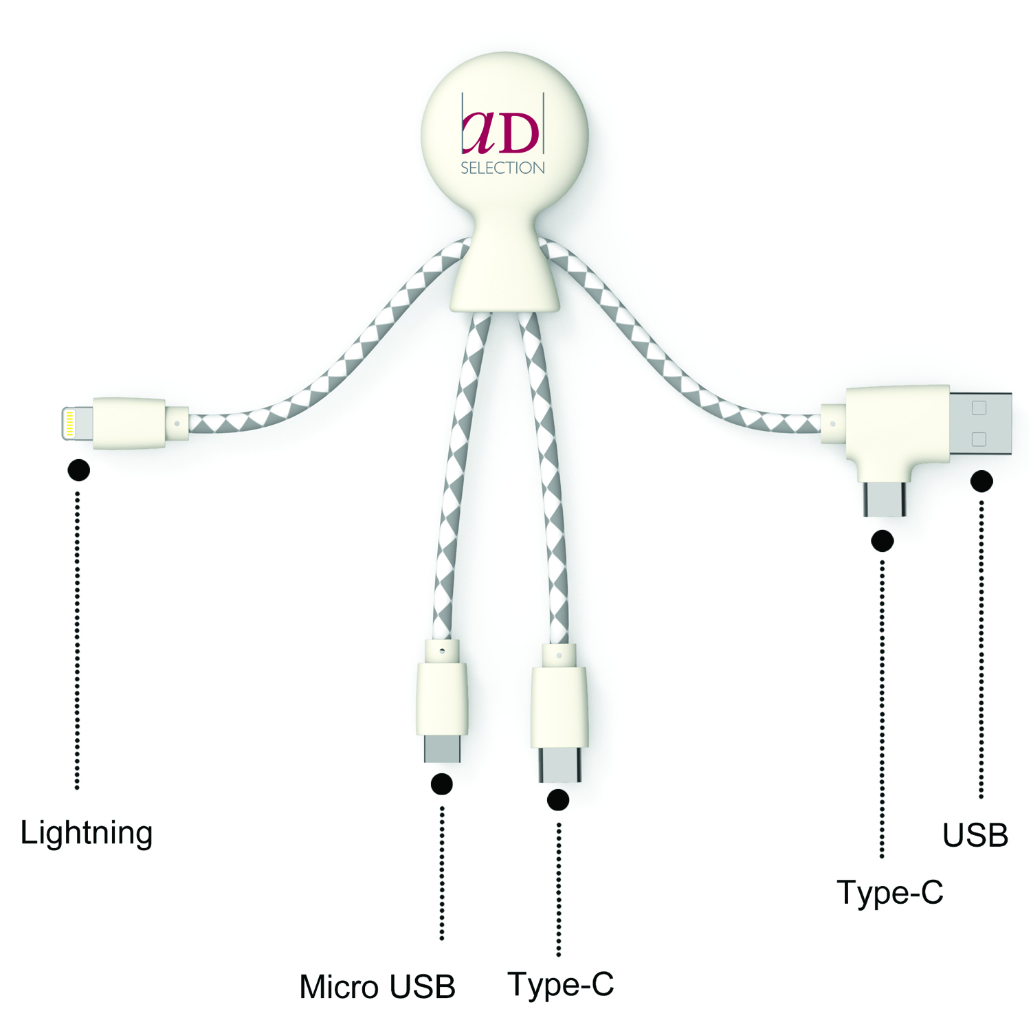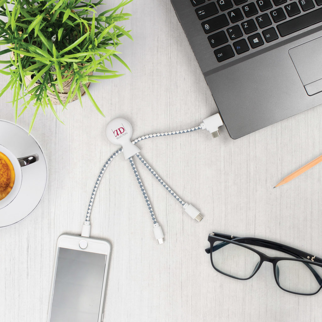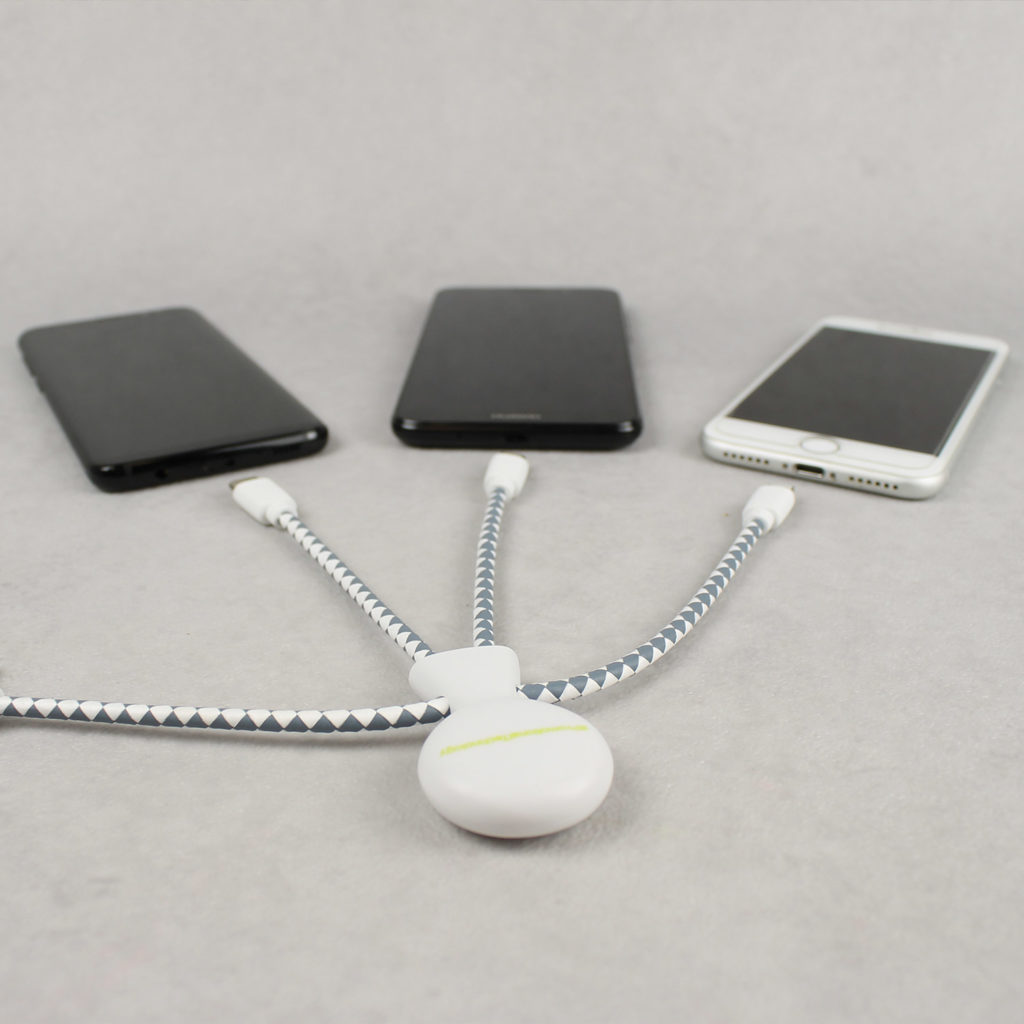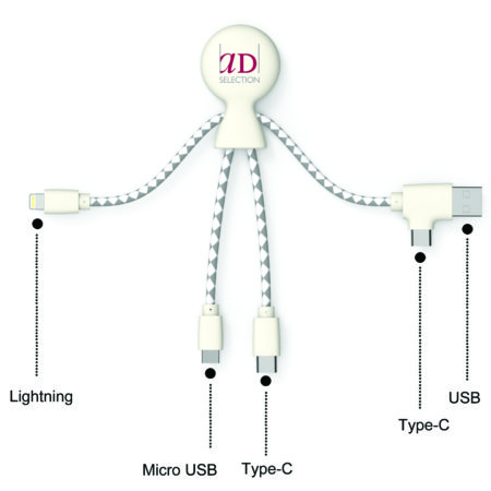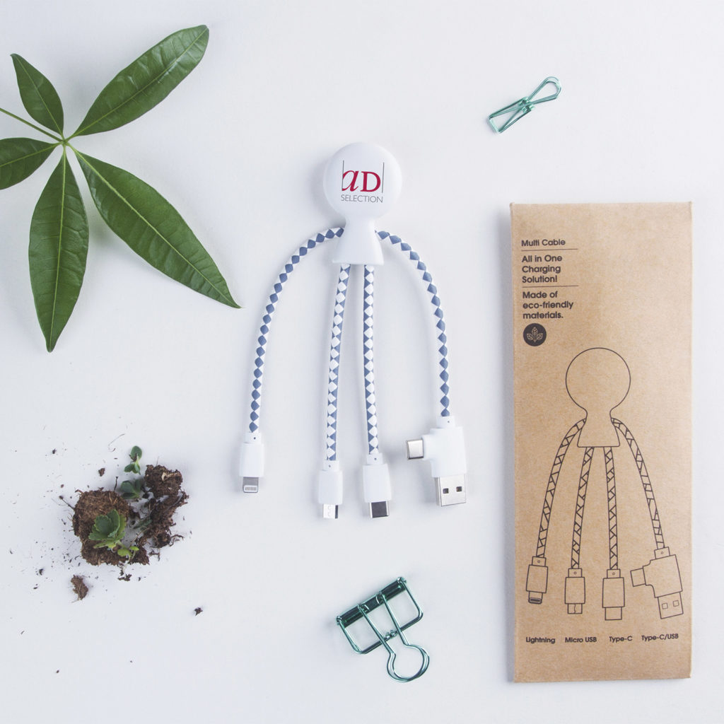 GREEN CABLE è il nostro ultimo cavo di ricarica multifunzione, dotato di 5 connettori diversi per sincronizzare tutti i tuoi dispositivi tecnologici. Ed è anche ecologico! Unisce prestazioni straordinarie in un design che utilizza materiali facilmente biodegradabili o riciclabili. Il corpo è realizzato in plastica biodegradabile e le gambe flessibili in carta DuPont. Confezione in carta ecologica con informazioni sul prodotto.