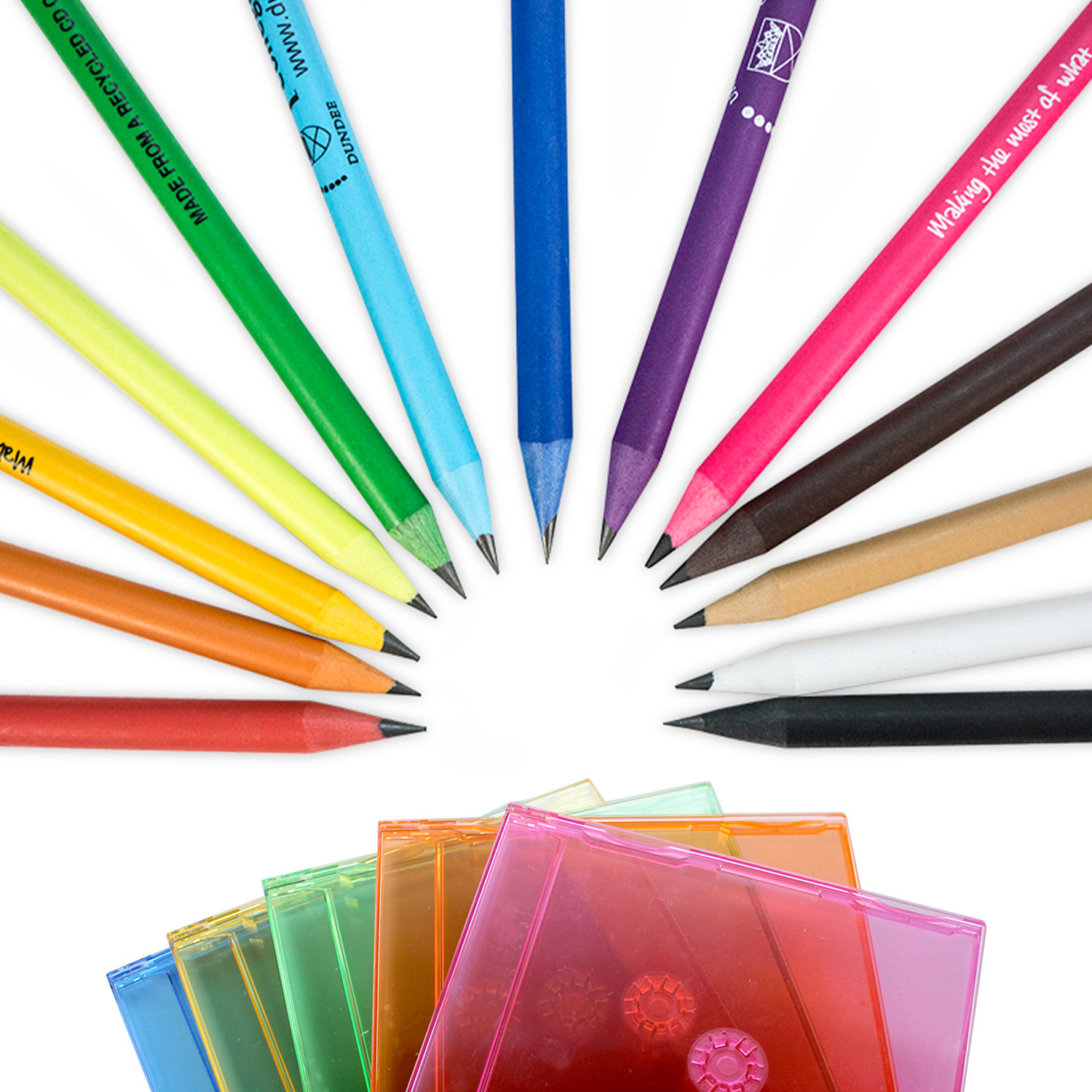 Matita realizzata con custodie di CD riciclate, ideale da inserire in una brochure per completare la vostra comunicazione. Stampa ad un colore del vostro logo.