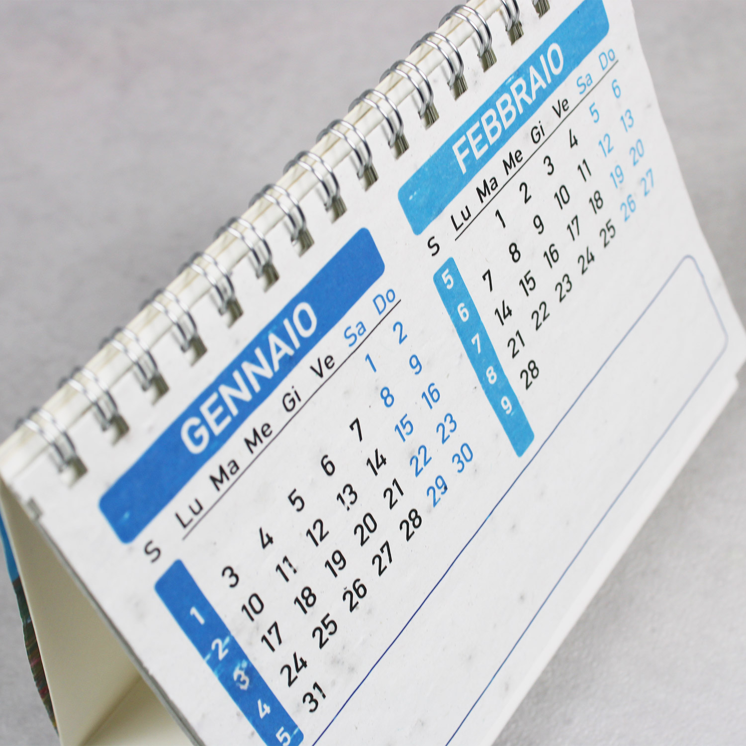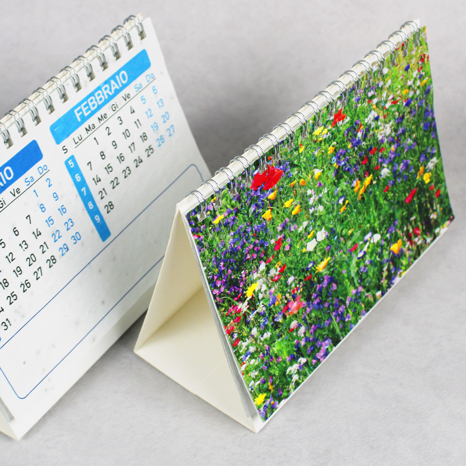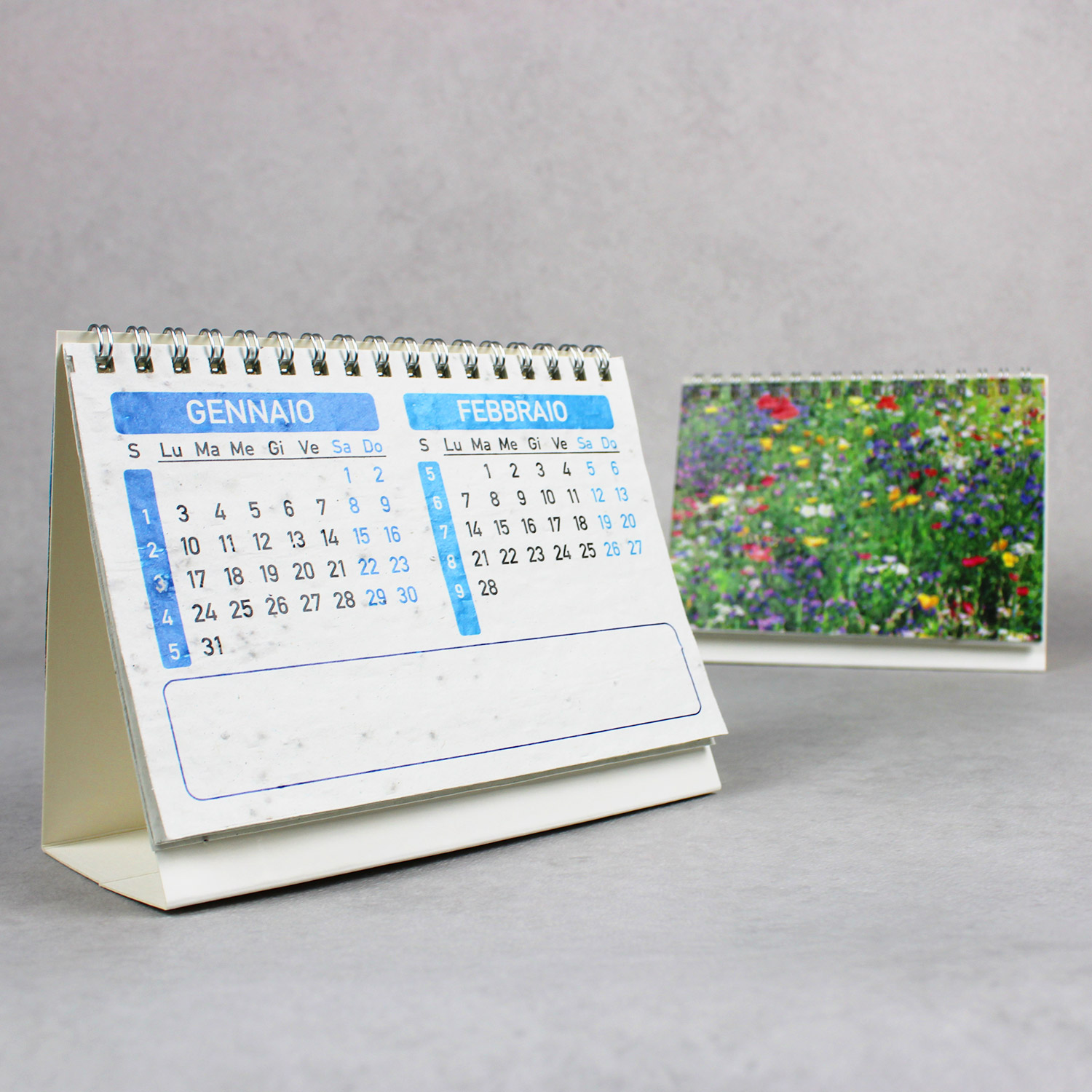Calendario da tavolo realizzato con una carta speciale che contiene dei veri e propri semi tra le sue fibre.