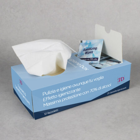 Scatola contenente fazzoletti e salviette igienizzanti.