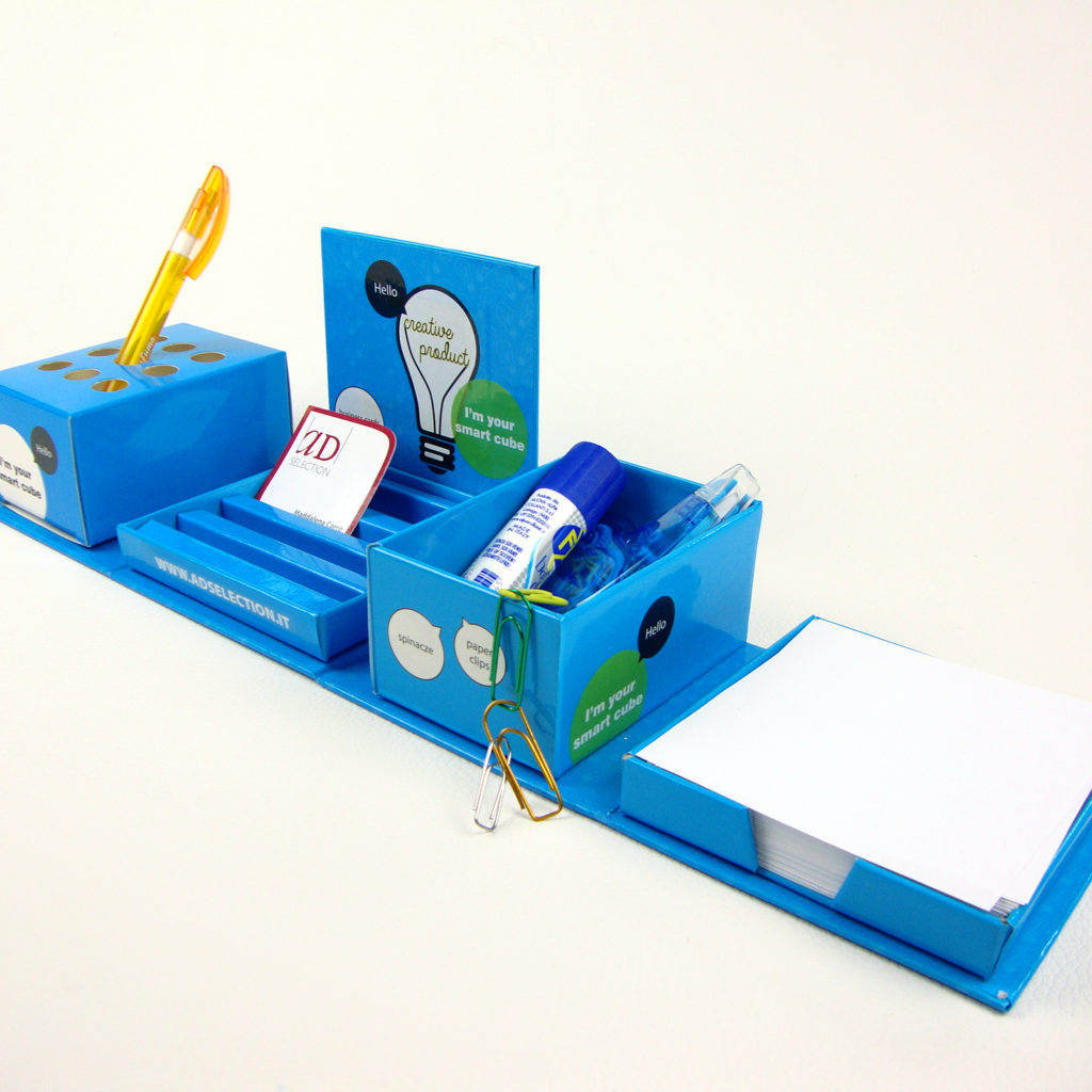 È una scatola cubica realizzata in cartotecnica, ricca di creatività e d’ingegno che cela al suo interno un set multifunzionale da scrivania, dove troveranno posto penne, biglietti da visita, graffette o piccoli oggetti e foglietti per appunti.