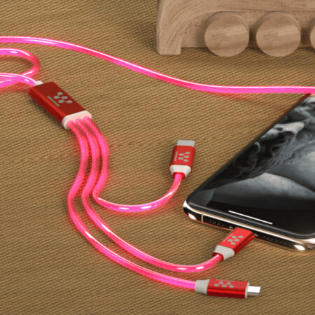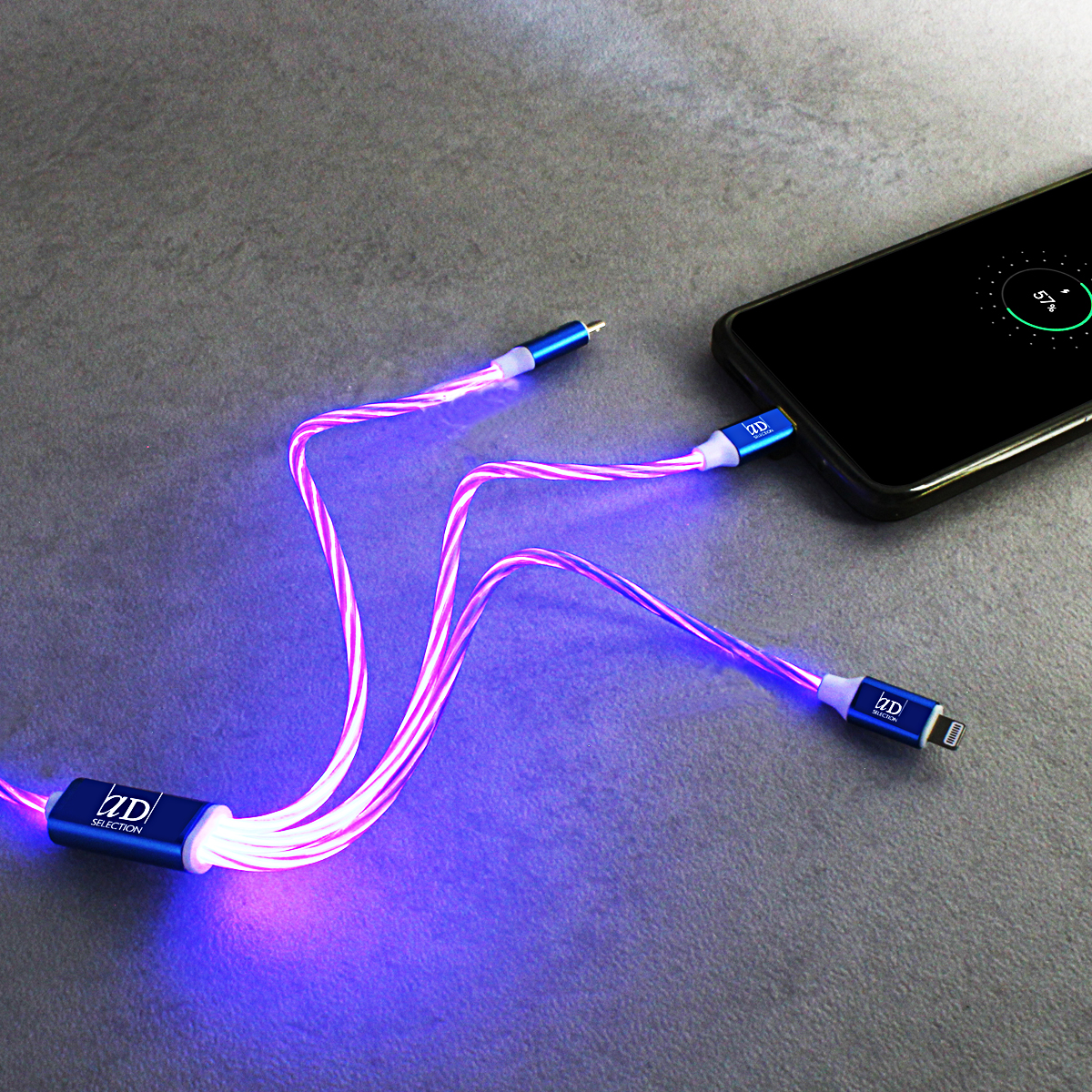 Multicavo luminoso, con USB in input, da 120 cm per la ricarica con connettore multiplo micro USB, lightning e Type-C tutti in output e con portata 2A, adatto alla ricarica di smartphone e altri dispositivi. Durante la ricarica il cavo produce una luce led intermittente ed è disponibile in rosso, blu, verde e azzurro.