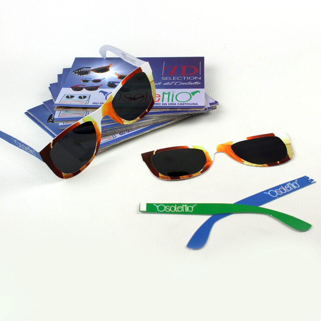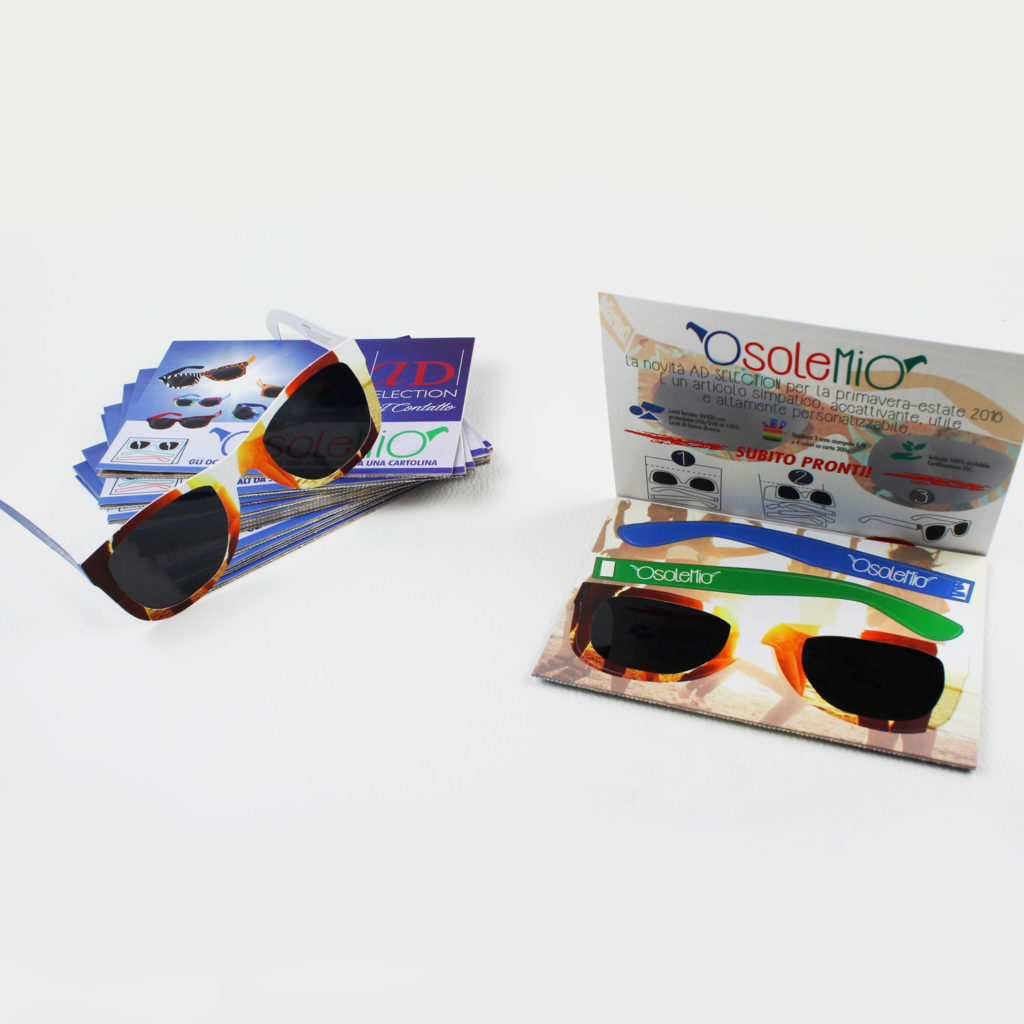 Si tratta di un dépliant a 3 ante che contiene al suo interno degli occhiali da sole in carta prefustellati e quindi montabili, con vere lenti in lamina. Si possono tenere in auto, in tasca, nella borsa, ovunque…d’altra parte avete mai visto occhiali da sole che occupano lo spazio di una cartolina? Ideale proposta estiva per eventi aziendali ed occasioni speciali, e per attività di promo incentive di prodotti, ottimo per il direct mailing.