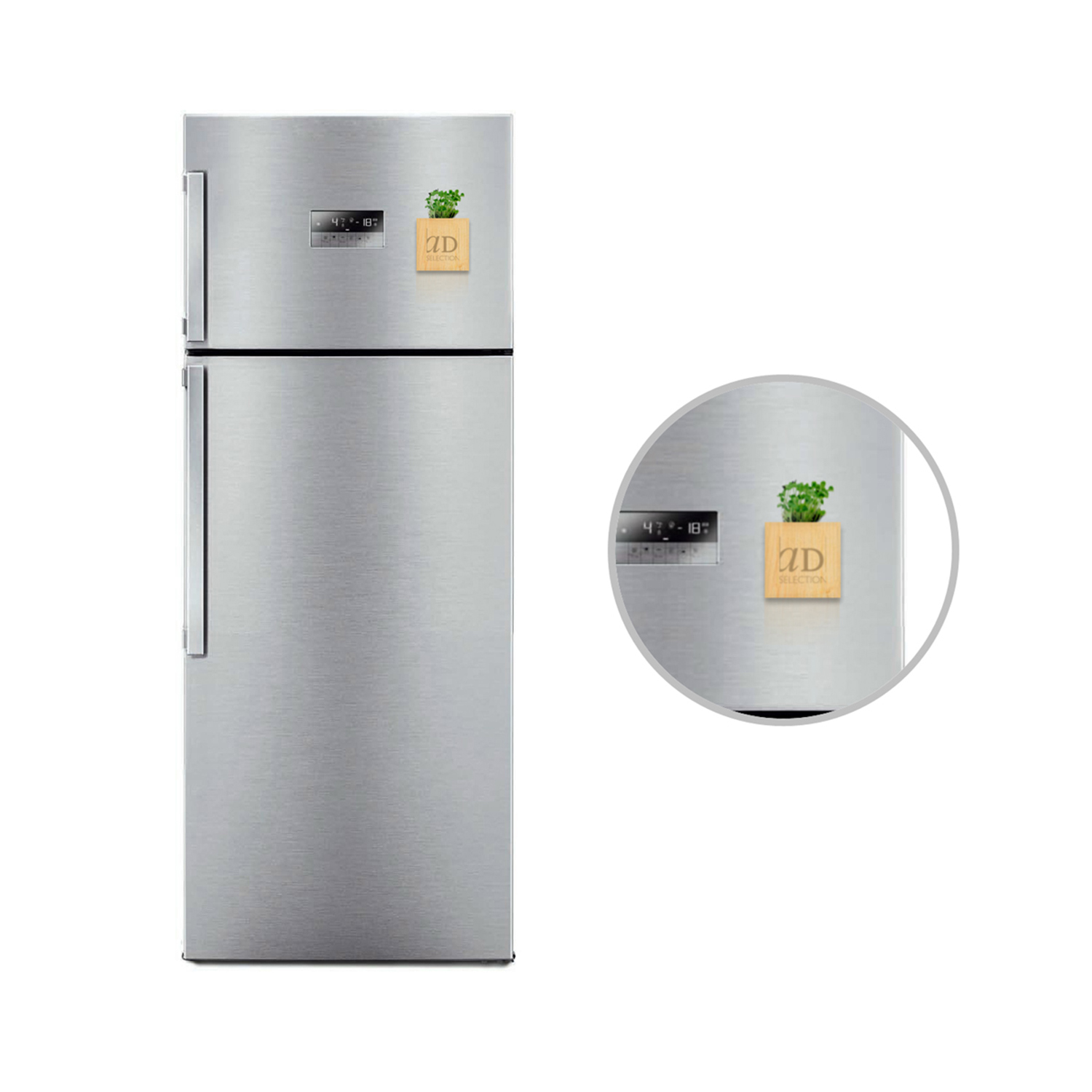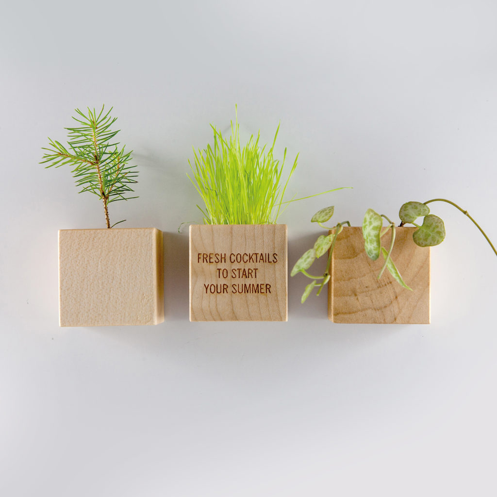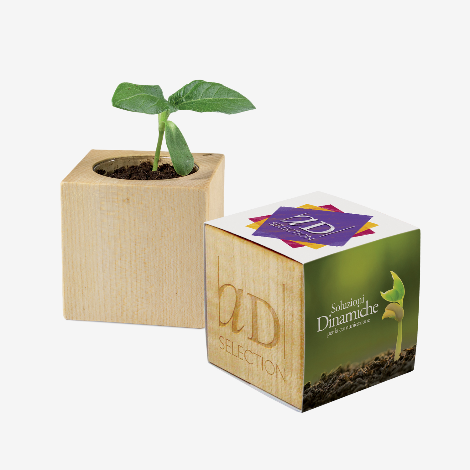 Cubetto in legno contenente torba e semi a scelta tra le varietà disponibili. Personalizzato tramite una fascetta stampata in quadricromia e incisione sul cubetto. Il cubetto potrà esser dotato anche di magnete per clip o per esser applicato su tutte le superfici metalliche.