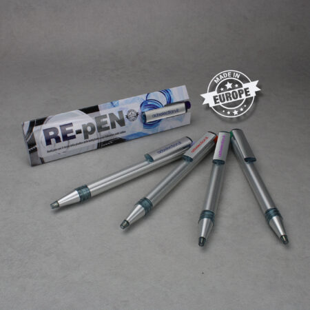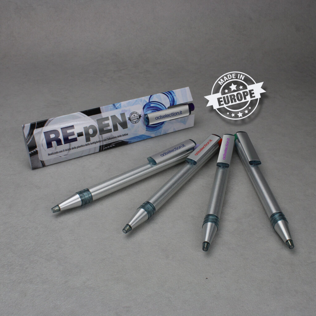 RE-PEN È MADE IN EUROPE. NUOVA VITA PER LE BOTTIGLIE DI PLASTICA E LATTINE DI ALLUMINIO! Re-Pen offre un ulteriore contributo alla tutela e sostenibilità dell’ambiente grazie al fatto che è realizzata dalle bottiglie in PET e dall’alluminio delle lattine per bevande ENTRAMBE RICICLATE AL 100%! Una vera produzione ad impatto climatico zero. Il pulsante è disponibile in diverse colorazioni ed è possibile personalizzare la confezione / busta.