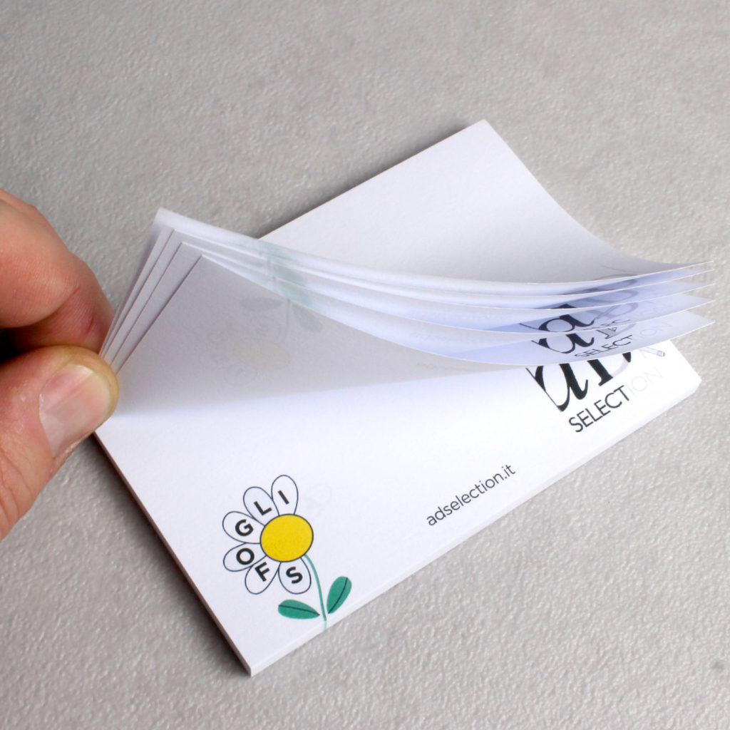 Blocchetto di foglietti adesivi personalizzabili singolarmente con stampa variabile da foglio a foglio. Con questa modalità con un solo articolo è possibile creare una storia o animazione, proporre una galleria fotografica, presentare una linea di prodotti, ecc… Un articolo dinamico e interattivo pur essendo un classico di tutte le scrivanie!