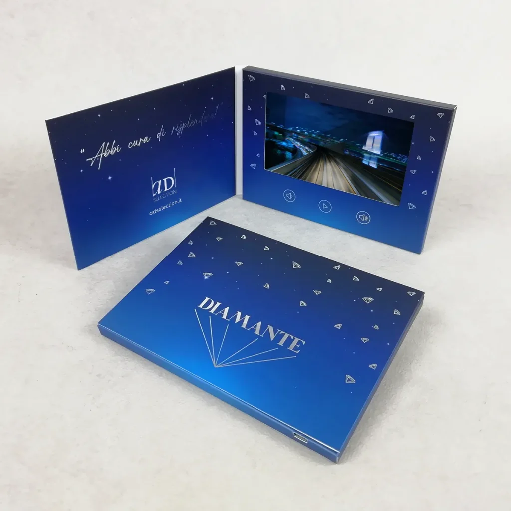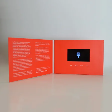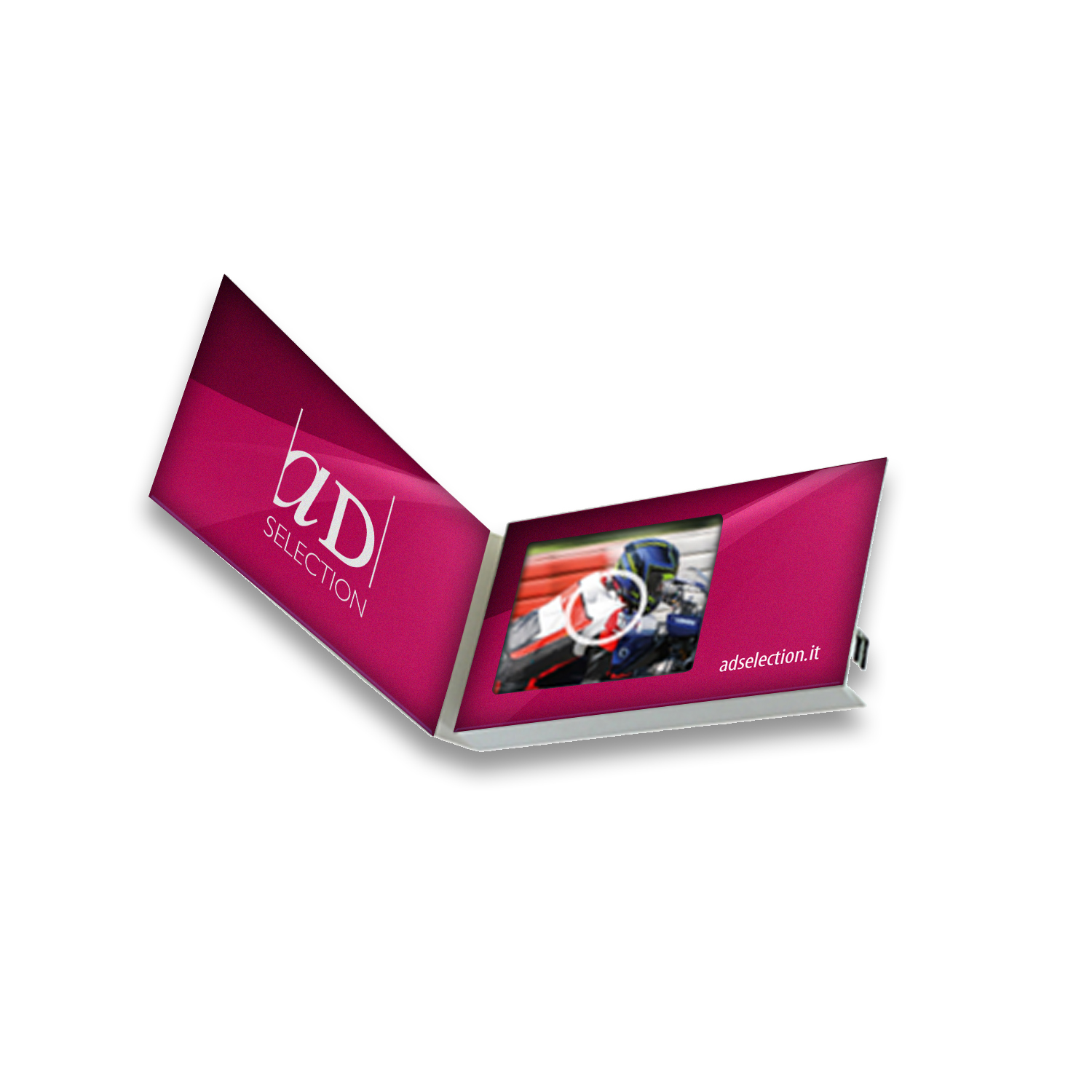 Display LCD integrato in una lussuosa cartella di presentazione, stampata con il tuo design. Dopo l’apertura, i file video inizieranno a riprodursi automaticamente o tramite un pulsante di accensione. L’audio viene riprodotto da un altoparlante integrato. La batteria ricaricabile tramite cavetto USB consente l’uso a lungo termine della brochure video.